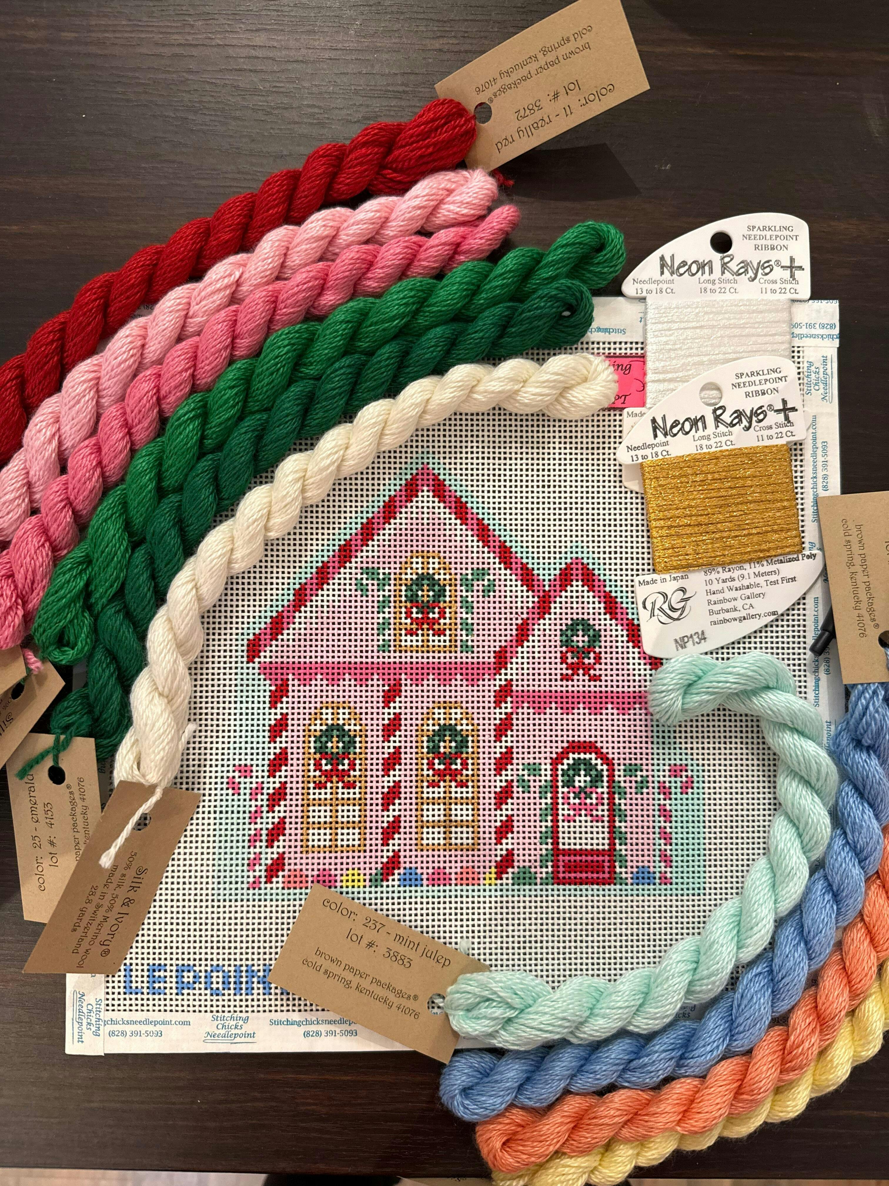 Our Christmas Village Peppermint House canvas is a beautiful 6.5” x 6” design, hand painted on 13 mesh canvas. Total canvas size is 10.5” x 10”.