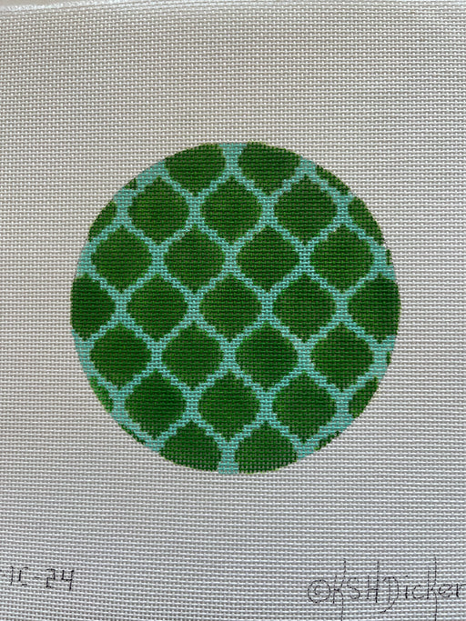 Planet Earth & Lee 4” Round – Quatrefoils – emerald on aqua w/ fuchsia letter (specify letter or blank)