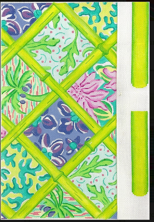 Med. Whale – Quatrefoil Damask w/ Monogram Medallion – pinks & greens (stitch guide & lettering chart in notebook)