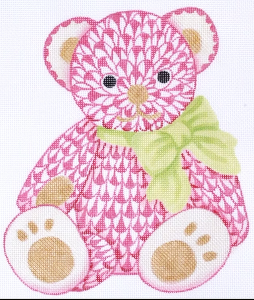 Herend-inspired Fishnet Teddy Bear – pink w/ gold & lime ribbon