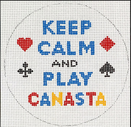 Planet Earth & Lee 4” Round – Keep Calm & Play Canasta – red, black, yellow & blue on white