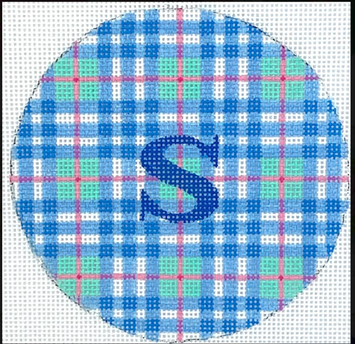Planet Earth & Lee 4” Round – Madras Plaid – turquoise, blue & pink w/ blue letter