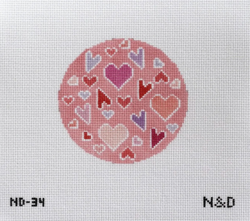 Our Crazy Hearts Round Needlepoint Canvas on 18 mesh canvas. Canvas features colorful whimsical hearts on a light pink background.