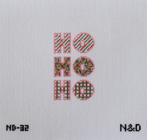 The Sprinkle Ho Ho Ho Needlepoint Canvas on 18 mesh canvas. Canvas features "Ho Ho Ho" in stripes, "sprinkles," and plaid.