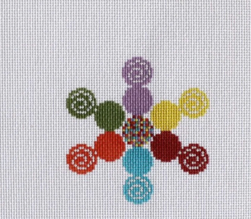 View full detailsThe Sprinkle Candy Snowflake needlepoint canvas on 18 mesh canvas. The design is a snowflake shape made of colorful candies and sprinkles.