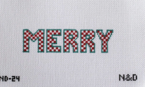 The Merry Checkerboard Letters needlepoint design on 18 mesh canvas. The design has MERRY in green and red in a checkerboard pattern.