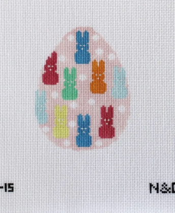 Peeps Bunny Egg Needlepoint Canvas on 18 mesh canvas. The design has marshmallow-inspired colorful bunnies on a light pink background. STITCH GUID...