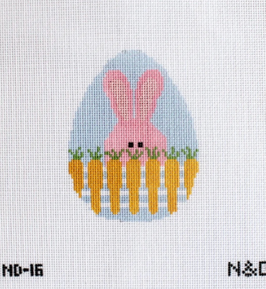 Bunny With Carrot Fence Egg on 18 mesh canvas. The design has a bunny behind a fence made of carrots. STITCH GUIDE SOLD SEPARATELY