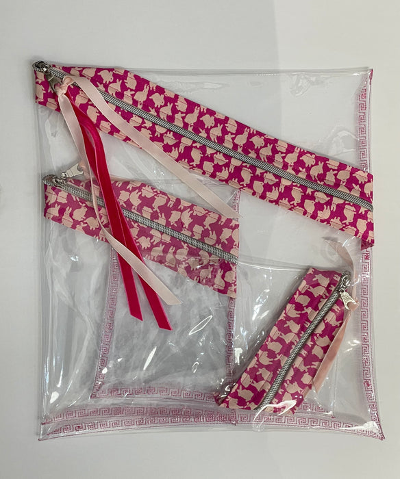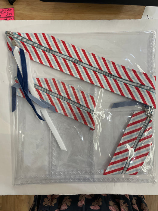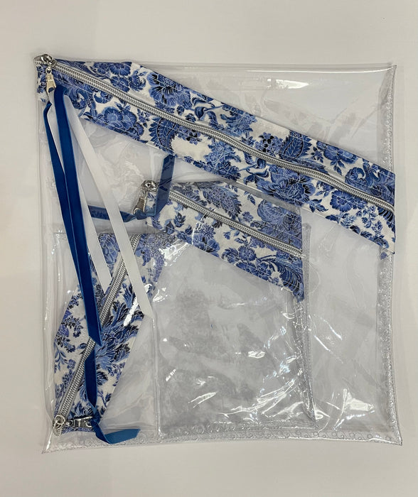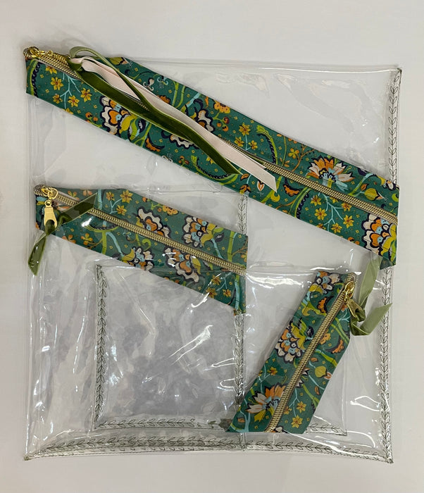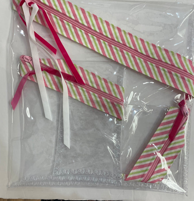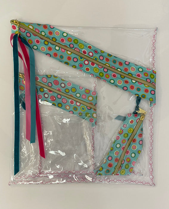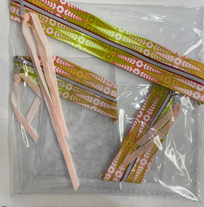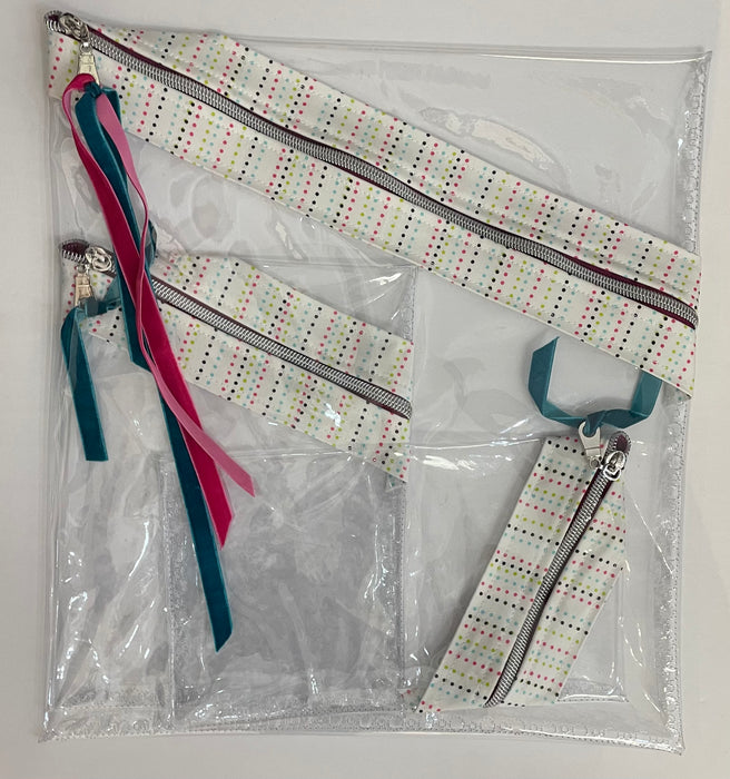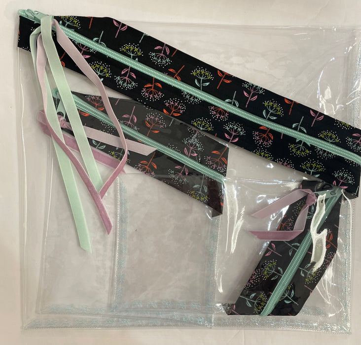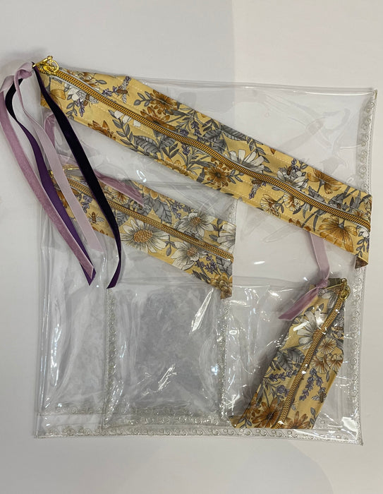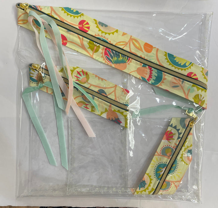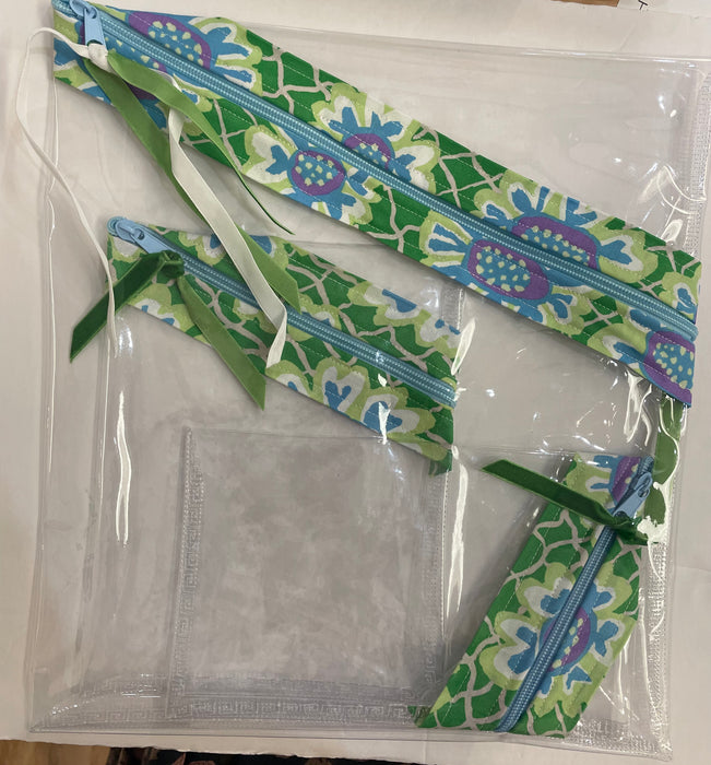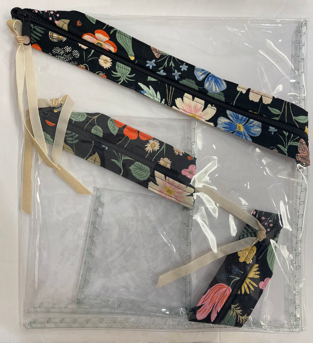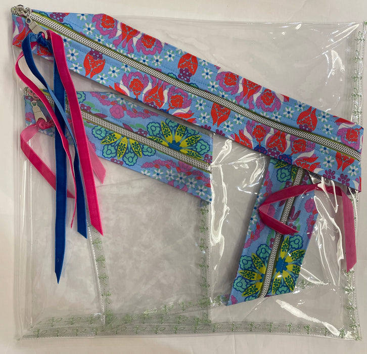Fun and whimsical, but yet classy and practical project bags. Each are created with one-of-a-kind fabrics and a high-quality clear vinyl front. Store all of your project needs: canvas, scissors, threads, needle minders and of course a book! Three bags in one! BRAND NEW DESIGN!